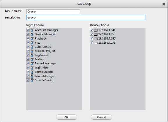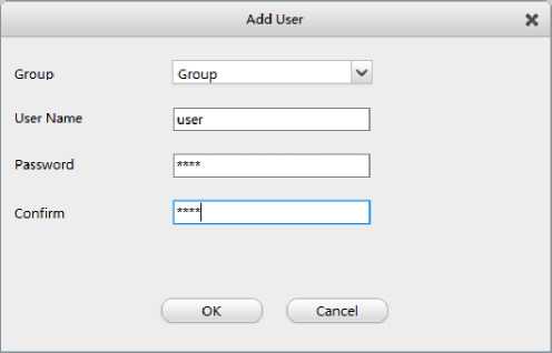 Input group name and its description, select the rights and device can be management, then click OK to create a new group. Then you can add users to this group by clicking add button in username. Input username and password to finish adding. Shown as Figure 9-2.