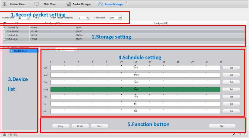 | 2 | Storage setting | Set the record storage partition, and the default partition is X:\Schedule |