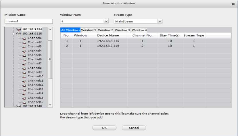 - Click new button to create a task, input Task name, select window number (the number of windows open when tour, maximum support 36), and Main/Sub Stream. For example: Figure 10-4means, channel1 and channel2 will tour in window1.
