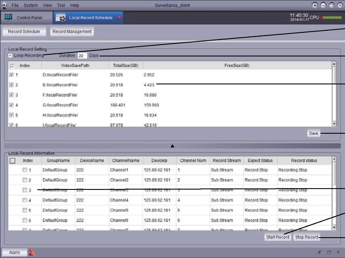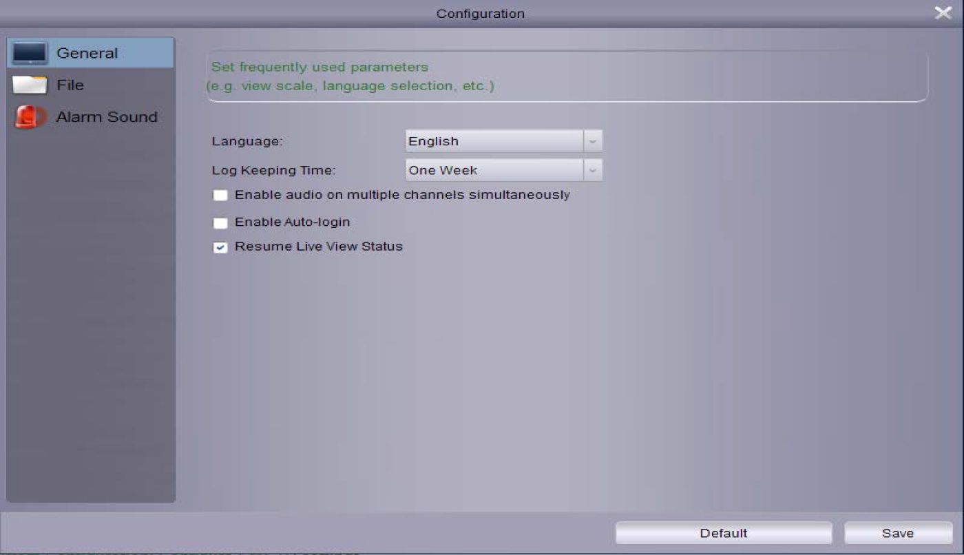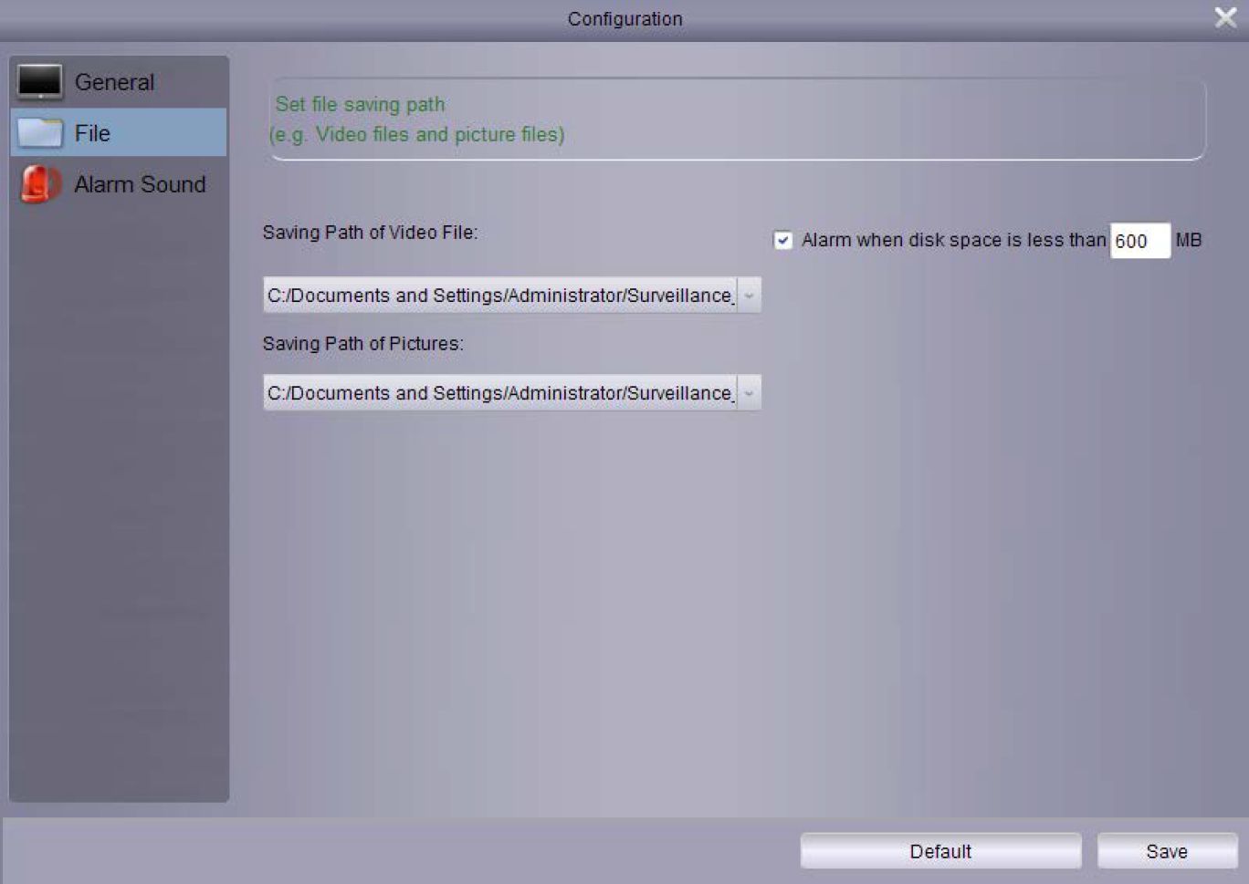 Alarm will appear if disk space is sufficient. When the disk space for saving is less than set space, the alarm will appear. The minimum value is 500MB.