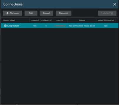 Select a server by clicking it in the item list and click Connect to connect with the selected server. Server resources will automatically appear in the left-hand panel.