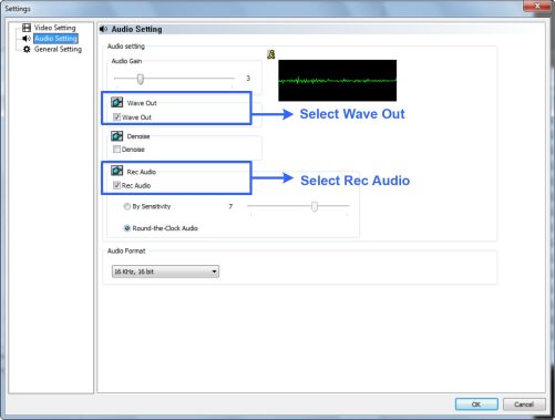 •Set to Wave Out: Enables live view audio. (See [Audio Setting] in Section 3.2)