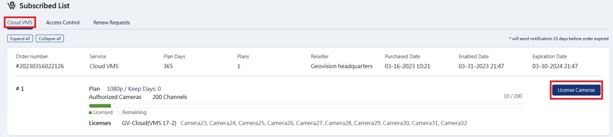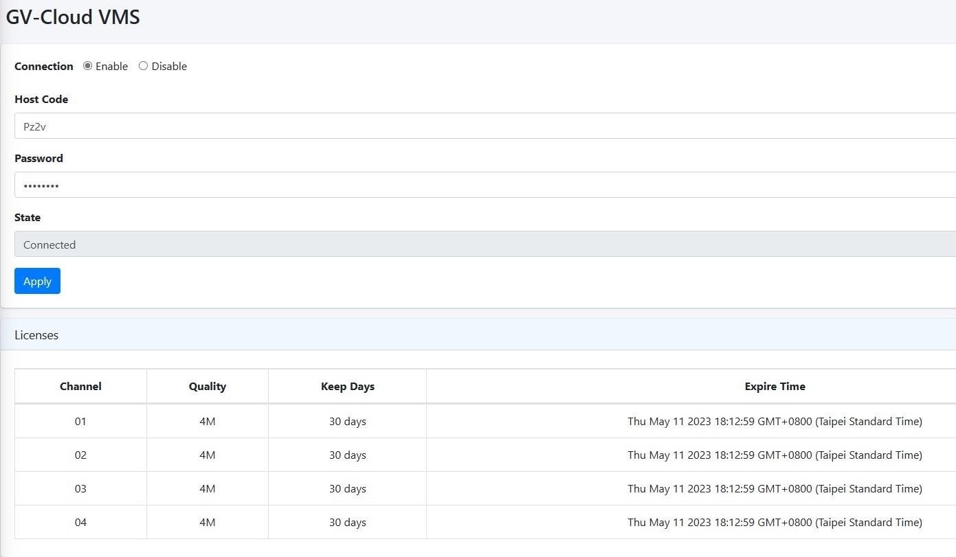 By adding a license, you can receive snapshots or back up video to GV-Cloud VMS. For details, see 2.2 Adding Licenses.