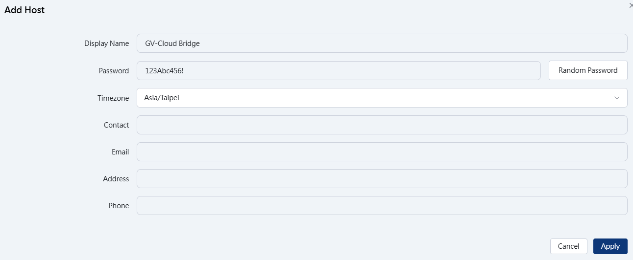 You must create a Host for each GV-VMS, GV-AI Guard, or GV-Cloud Bridge that you want to connect to. To create a host on GV-Cloud VMS, follow the steps below.