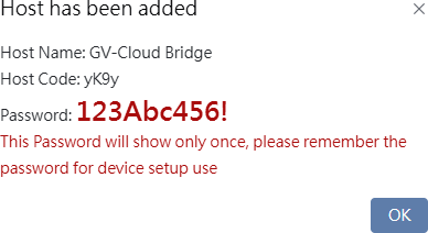 The message “Host has been added” will be displayed. Keep the Host Code and Password