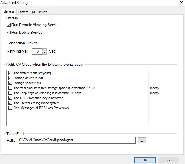 [Temp Folder] The path to store logs and recordings to be sent to GV-Cloud VMS.