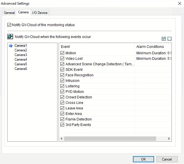 [Notify GV-Cloud when the following events occur] Select a camera from the list, and then select the type of event or data to be sent to GV-Cloud VMS. By double-clicking the following two fields, you can specify the alarm conditions for specific events.