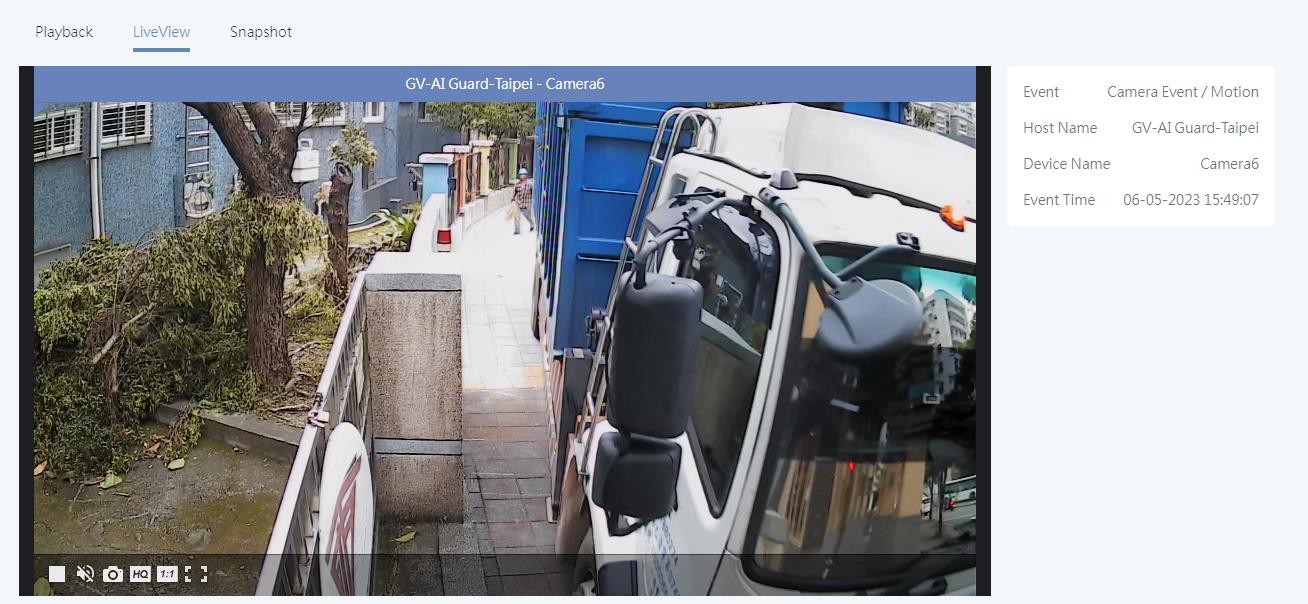 Note: When you click Playback and no video is displayed, the video clip may not have been created yet. The maximum length of a video clip created in GV-Cloud Bridge is 30 seconds, while the default length of a video clip created in GV-VMS / GV-AI Guard is 5 minutes, you may have to wait until the specified length has elapsed after an event begins to view the video playback.