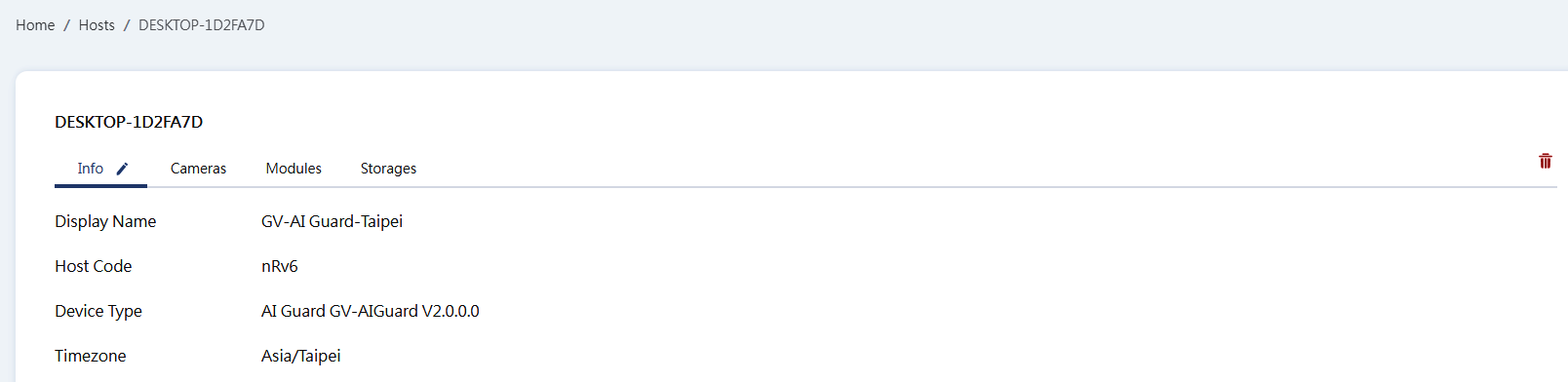 The Hosts page allows you to create host accounts and view the status of the host’s cameras, I/O devices, and storage. Click a created host in the list to access the following functions.