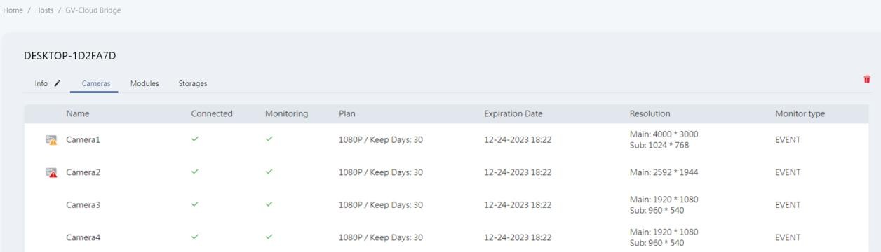 You can view the camera’s connection, monitoring status, applied license plan, plan expiration date, camera resolution, and monitoring type on the Cameras page.