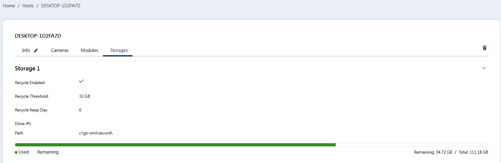 On the Storages page, you can view the host’s storage information such as the recycle threshold, Keep Day, storage path, and remaining storage space.