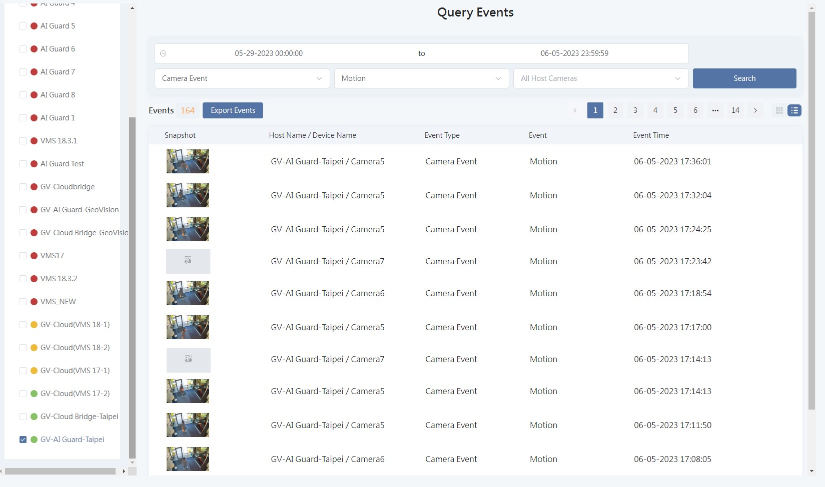 Display coming motion and AI events. Use the Filter above the Host List to display the events of specific hosts.