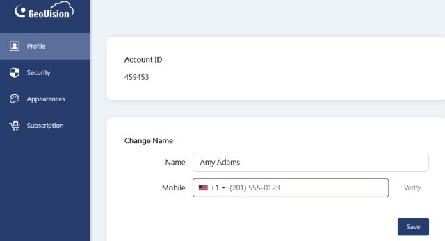 Account Settings: This option allows you to change the GV-Cloud account’s profile (Profile), password (Security), language setting / UI theme / time format (Appearances), as well as check and add subscriptions (Subscription).