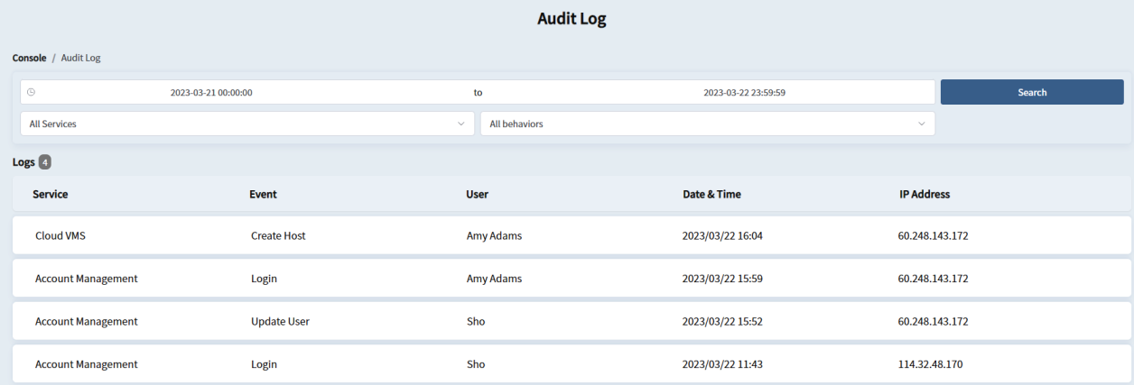 Audit logs are records of events and changes made by your GV-Cloud accounts that provide a complete record of account activities. Therefore, audit logs are a valuable resource for administrators investigating suspicious network activities and diagnosing problems.