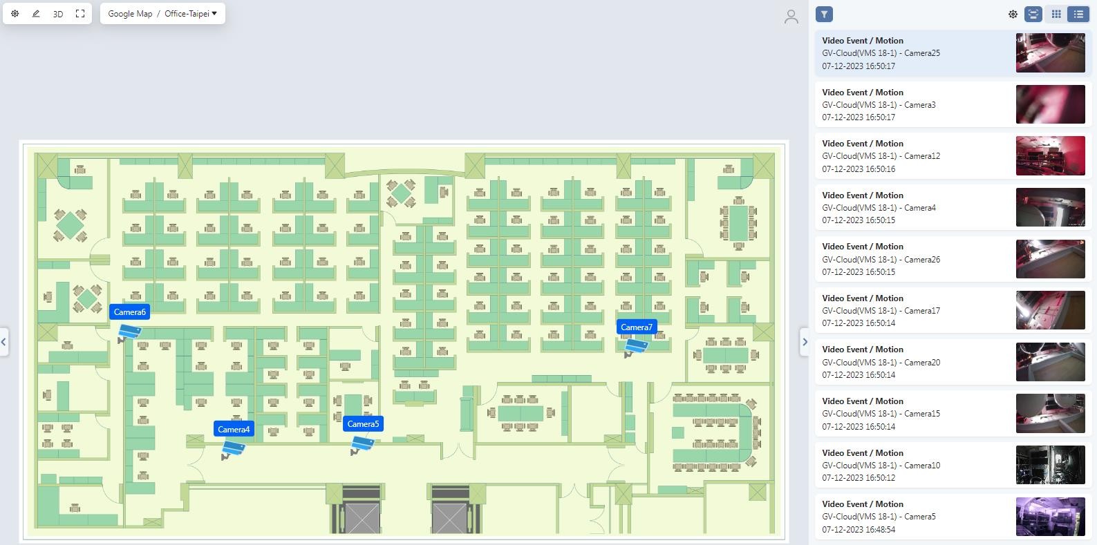 You can place the icons of connected cameras on Google Maps or on a map you uploaded to GV-Cloud. The map will help you quickly pinpoint the location of an event or the devices you have installed.