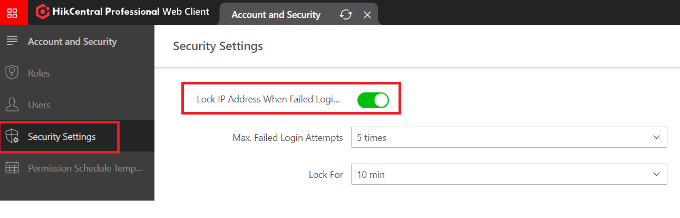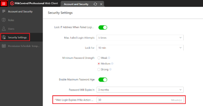 In the Hik Central Web CLient go to “General->Account and Security->Security Settings” Down towards the bottom of the page you will find the timeout settings options.