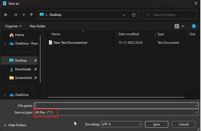 4. Here, click on the drop-down menu next to “Save as type” and change it to “All files (*.*)“.
