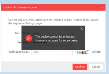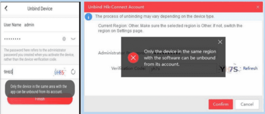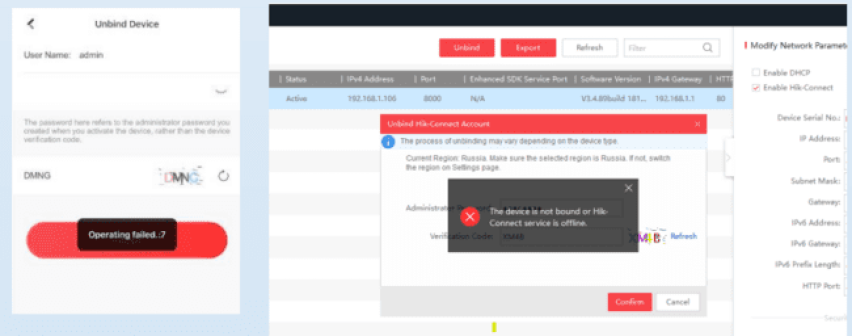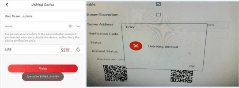 “102060” “102075” or “Unbinding failed. Not support by the device.” on App/SADP or “unlinking timeout” on local GUI