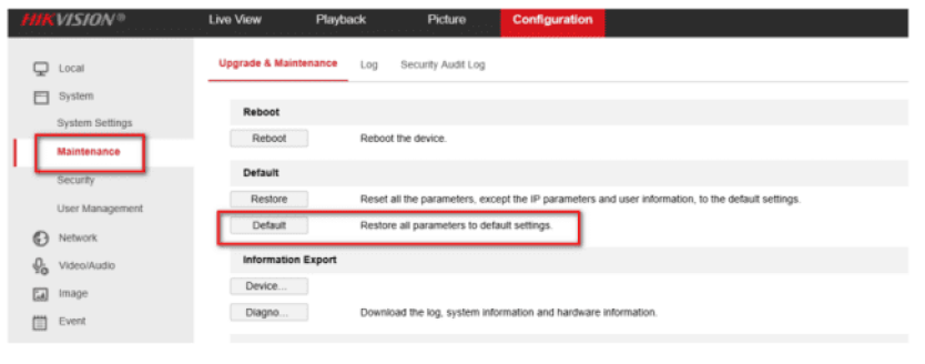 5. Go to Configuration – Maintenance – Default, default camera to factory settings, PoE NVR will automatically active and connect camera.