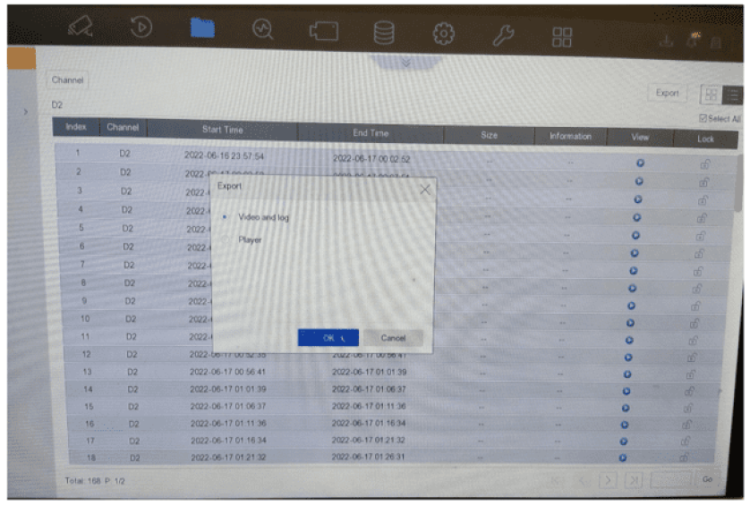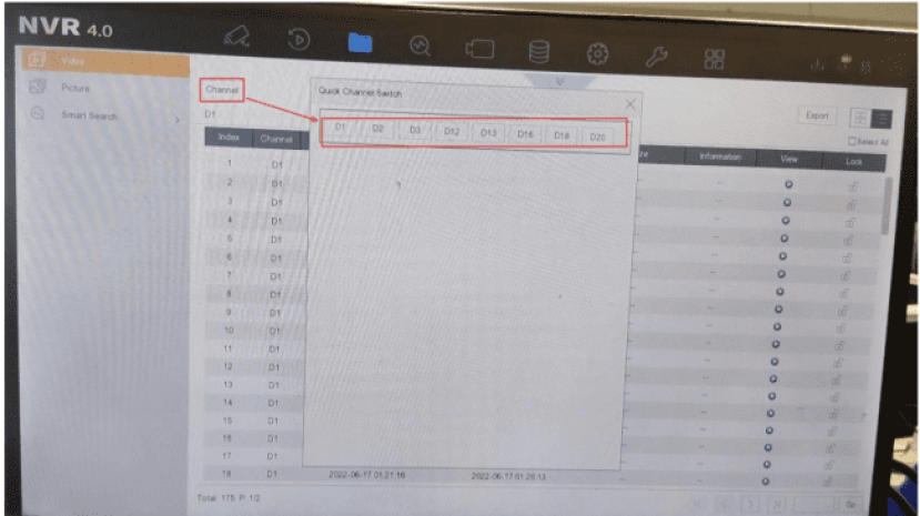 After search, it will show all the recordings of the channel 1 default, and if we want to check other cameras recording, we need to select the Channel to switch to other channel.