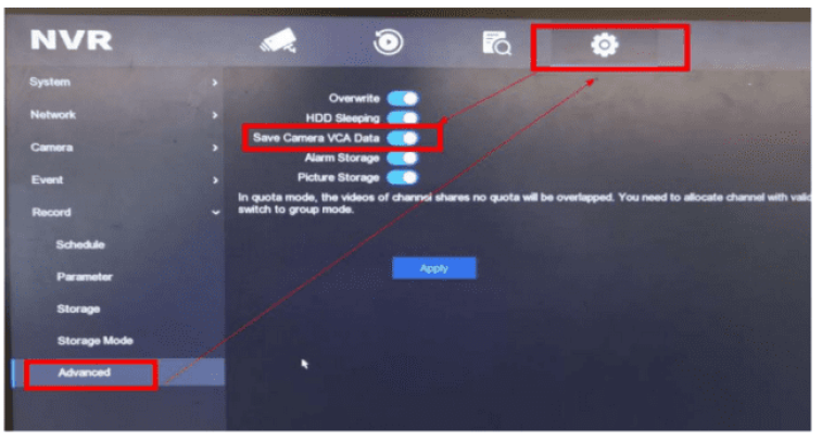 If the device is DVR/NVR/HVR, login local GUI, click Configuration Button – Advanced – enable Save Camera VCA Data.