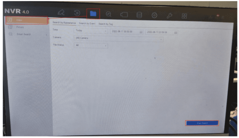 On local GUI, we need turn to the button of File > Video. In this page, we could select search condition, time and camera channel which you want to download. After select, click “Start Search”.