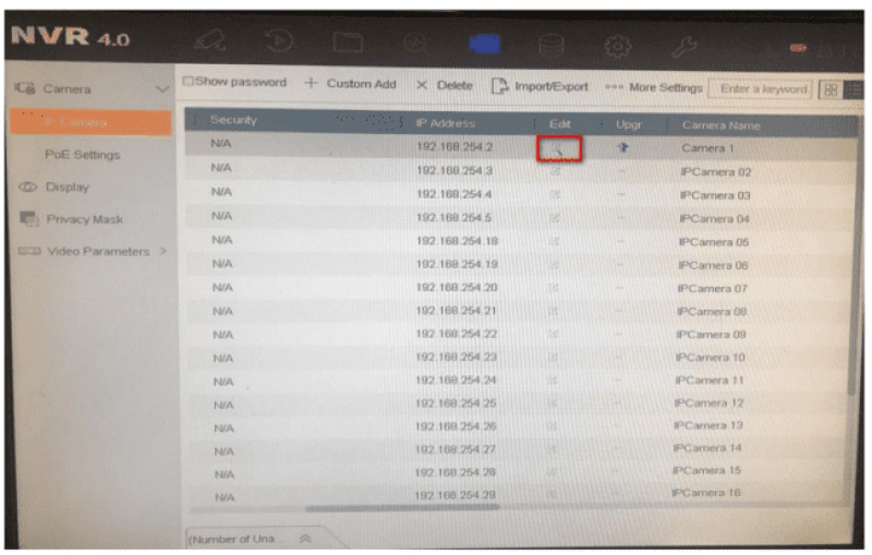 If the camera is connected to the PoE switch, please connect switch to NVR LAN port. The IP address of the camera must be in the same network segment as the IPv4 address of NVR. Then enter NVR Menu- Camera- IP Camera, select camera and click Edit icon.