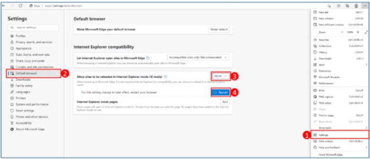 Turn to Setting > Default browser > Internet Explorer compatibility Under the “Internet Explorer compatibility” section, turn on the “Allow sites to be reloaded in Internet Explorer mode” toggle switch.