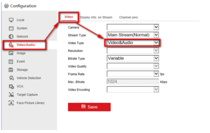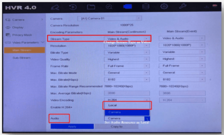 3. If you don’t want to change camera, please change camera Stream Type from video & audio to video and set DVR audio resource as local to solve the problem.