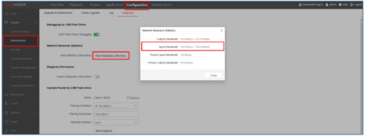2 & 3. Some devices support to check network resource statistics. Turn to Configuration > Maintenance > Network Resource Statistics. If the previous value of Input Bandwidth is almost equals to the latter value, please reduce bitrate.