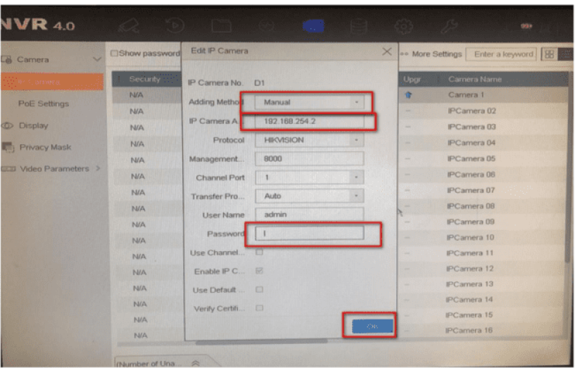 Select Adding mode to Manual, enter camera IP address and correct password, then click OK to add camera.