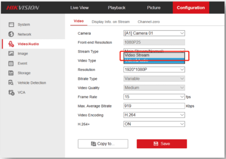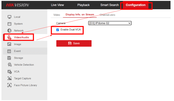 (b) Go to Configuration –Video/Audio– Display Info. on Stream to tick the checkbox of Enable Dual-VCA then Save.
