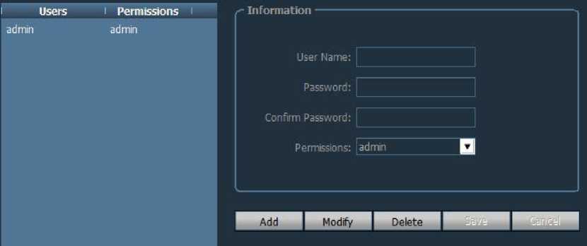 The factory default administrator user name is admin and the password is blank. After logging in, the administrator can add users, delete users, and set user permissions. User permissions are: admin, user, guest.