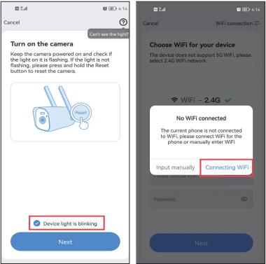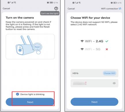 2, Click “Device light is blinking”—Next, then connect your home wifi.