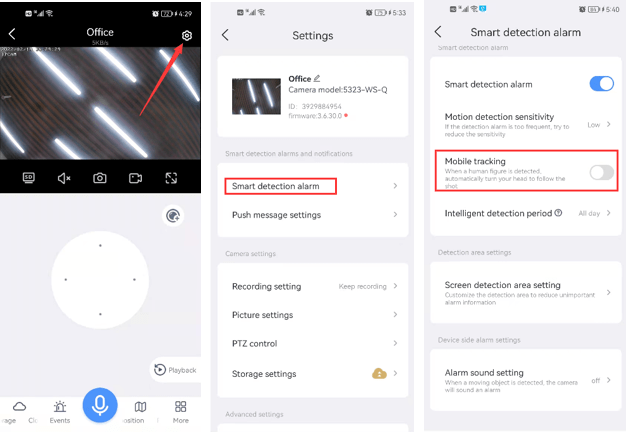 1, Into device—click setting icon on upper right corner—go to smart detection alarm—enable motion tracking option.