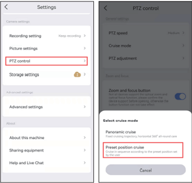 1, go to setting interface—ptz control—cruise mode—select preset position cruise.