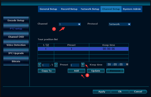 1) Right click the mouse–system setup–channel setup–PTZ setup. select correct channel. Add first cruise point,