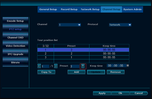 6) right click anywhere –return to the PTZ setting interface–apply—ok.