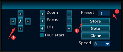 4) And then click “?” question mark into the PTZ control interface–click PTZ control option to set first position, then click store.