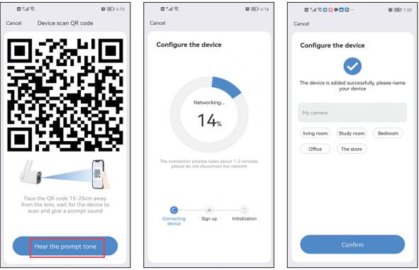 1, It makes a beep after reset the camera, open the App, click “+ Add camera” –scan QR-code on the camera.