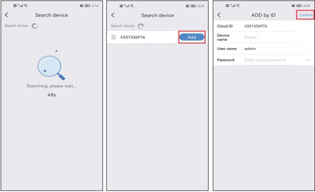 2.It will search device automatically, when find device, click Add. You don’t need to input any password, just click “Confirm” on upper right corner.