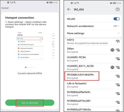 3, Click “Go to settings” to connect camera hotspot, find hotspot IPC*********, input password”11111111”.