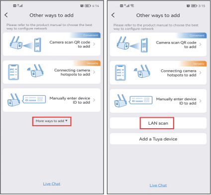 1.Please using the network cable connect camera to your router, then click “other ways to add”—More ways to add–select “LAN scan”.