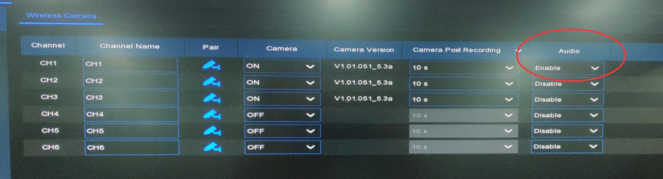 The first step is to activate the audio for each camera in the menu of the recorder. This is under ‘Channel’ in the main menu of the recorder.