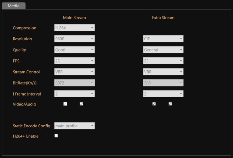 For cameras with a built-in microphone, or with an external microphone attached, you will have to enable audio for the camera. Now go to the encode option, you will see the mainstream Collom and extra stream Collom with four tick boxes at the bottom.