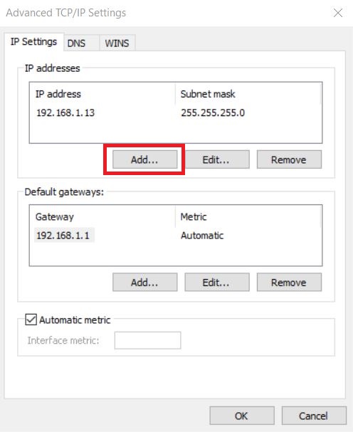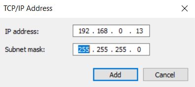 Once all of that information is filled out, click on Advanced in the bottom-right corner of the window, and it will open up the Advanced TCP/IP Settings where you will Add a new TCP/IP address. Please make sure the new TCP/IP address will match the subnet as the device you are trying to access, or else it will still not connect. NOTE: Please do not use the same IP address as the device. The Network Prefix and Subnet ID should be the same, but the Host ID should be different.