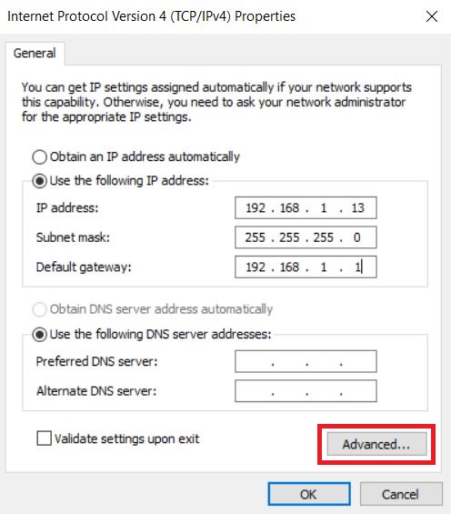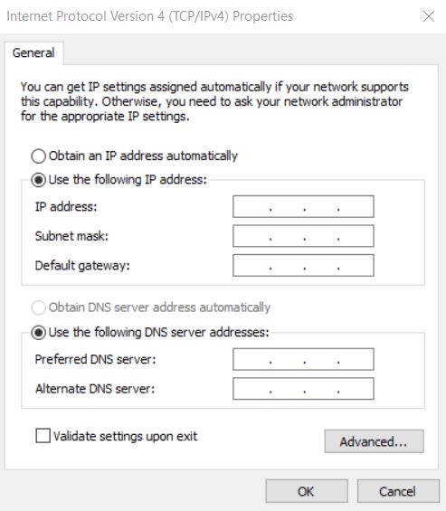 After clicking on the Ethernet connection the Ethernet Status window will pop up. Click on Properties → double-click on Internet Protocol Version 4 (TCP/IPv4). By default, your computer will be set to “Obtain an IP address automatically”, but we will want to change it to Use the following IP address. Remember in the steps above that we found out the IPv4 address of the computer through the command prompt. This is where it will come in handy again. When you select Use the following IP address the boxes below will become active. The information will be as follows: