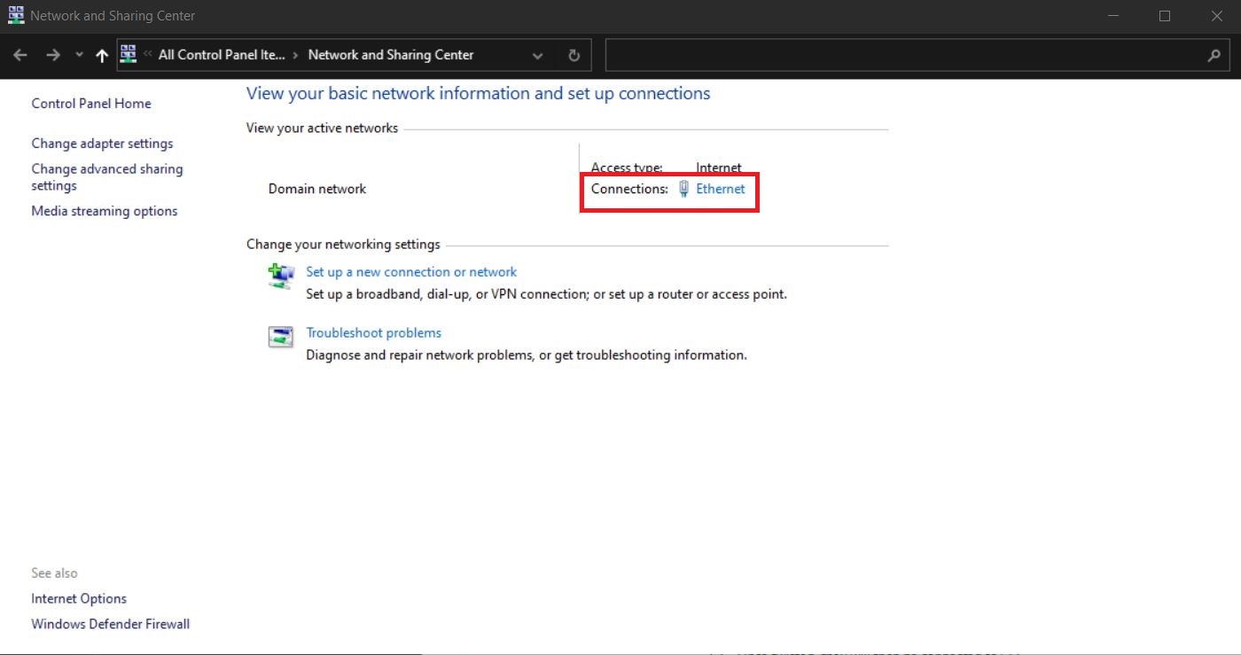On Windows 10 operating systems, it can be reached by either the Control Panel or from the Taskbar. In the Sharing Center you will be able to see all Connections the computer has. Click on the correct Ethernet connection.