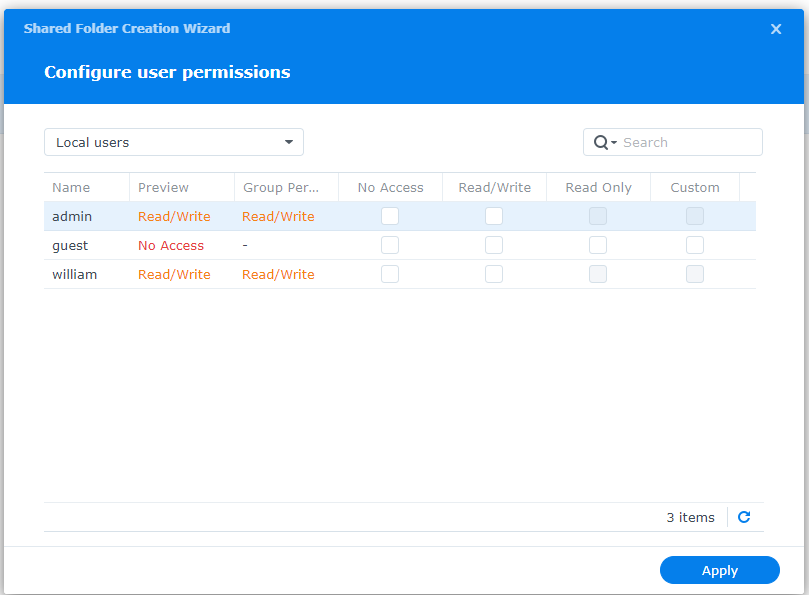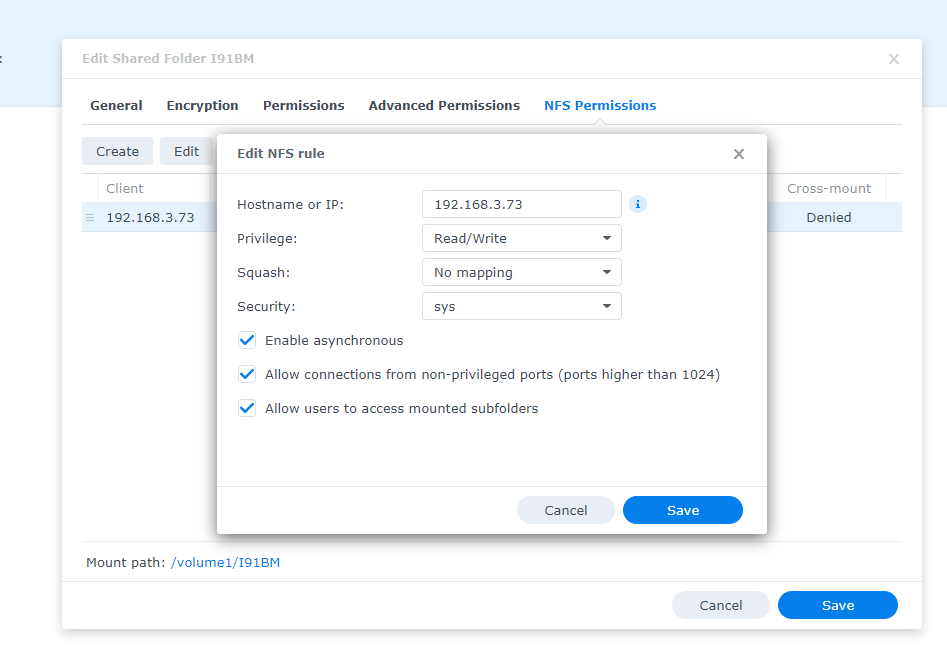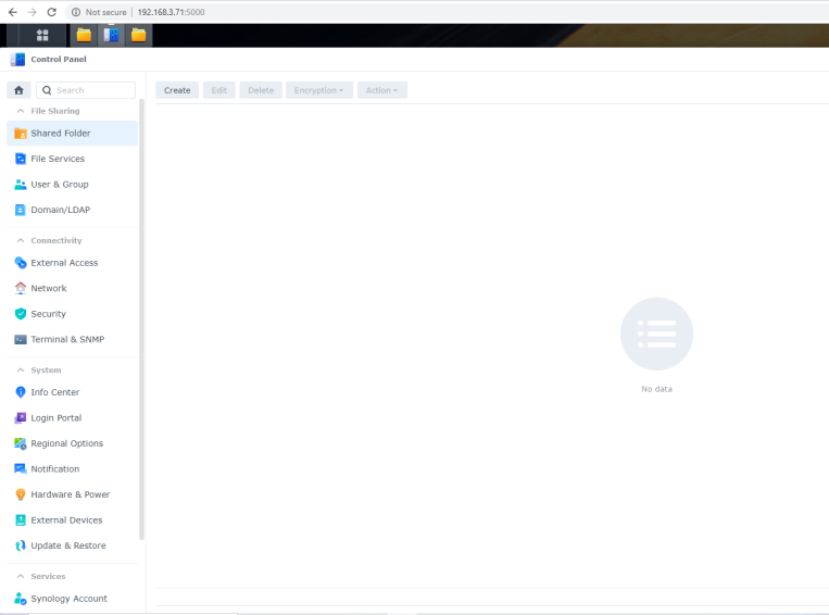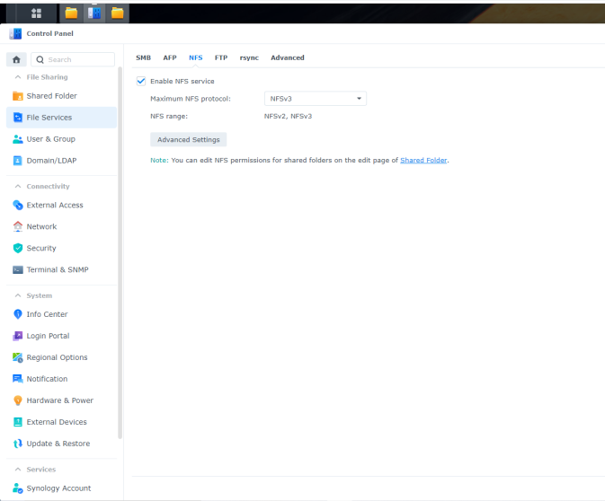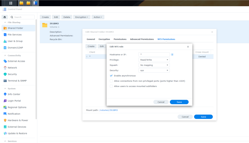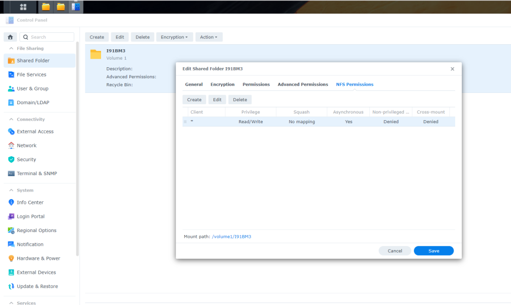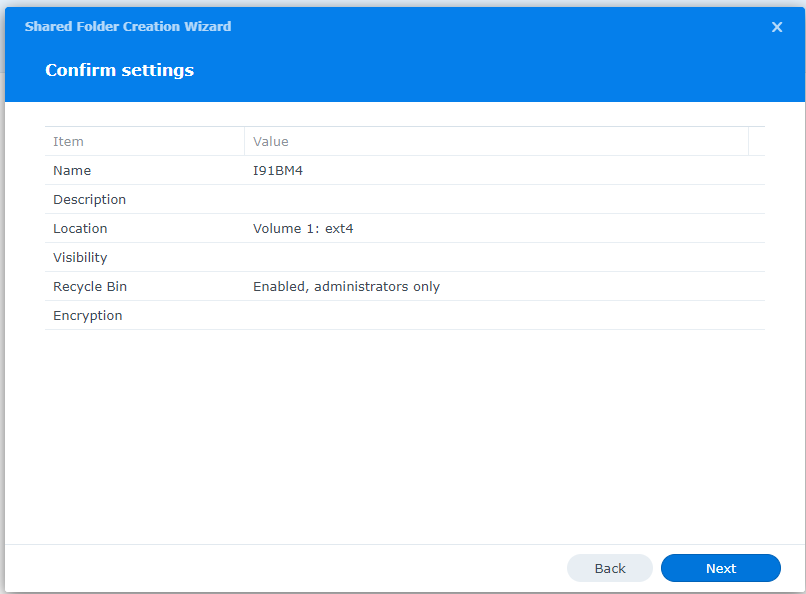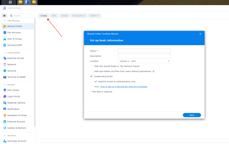 8. Go to Shared Folder to create a file to save the records from the camera. The Name can be anything. And click Next until you see the “NFS permissions”.