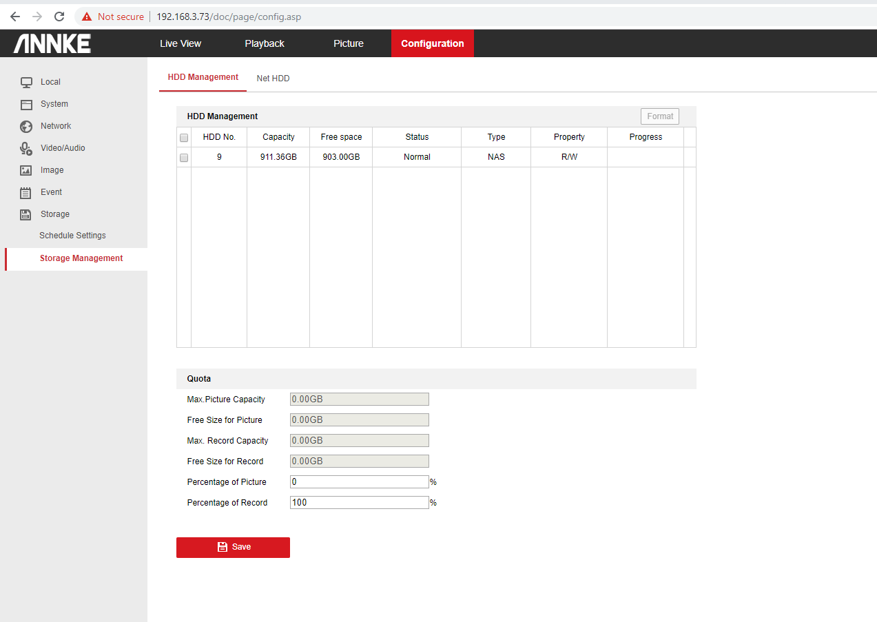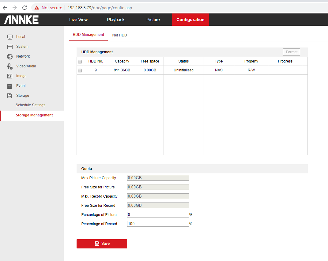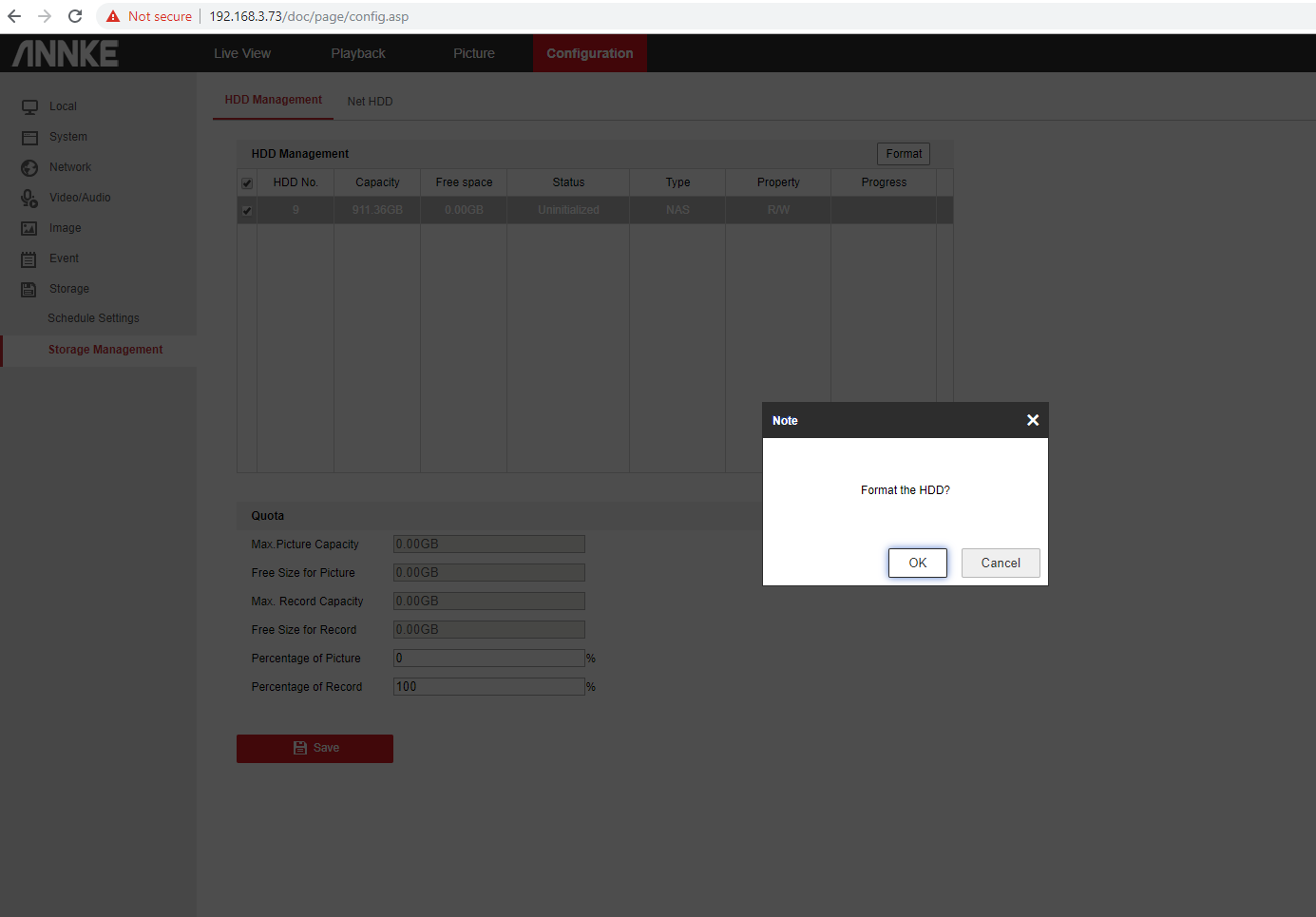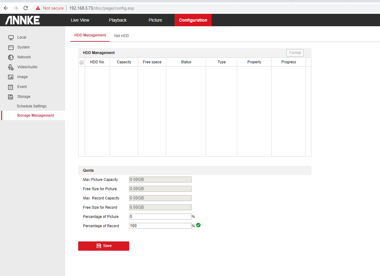 11. Go to Storage Management–HDD Management. Please adjust the “Percentage of Record” to 100%. Otherwise, the HDD formatting will be failed.